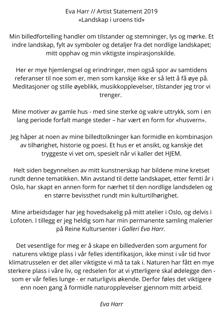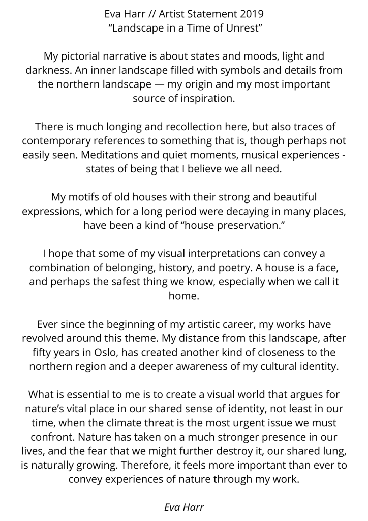 «Det viktigste for meg er å skape en billedverden som argument for den sårbare naturens viktige plass i vår felles identifikasjon. Verden slik den er i dag preger de fleste av oss med uro. Det er derfor ikke til å unngå at også dette gir etterklang i mitt kunstnerskap. Jeg forsøker å uttrykke en stille reaksjon på en overdøvende klimatrussel, og samtidig fastholde ordet «hjemlengsel» som noe universelt i det å være menneske» – Eva Harr.